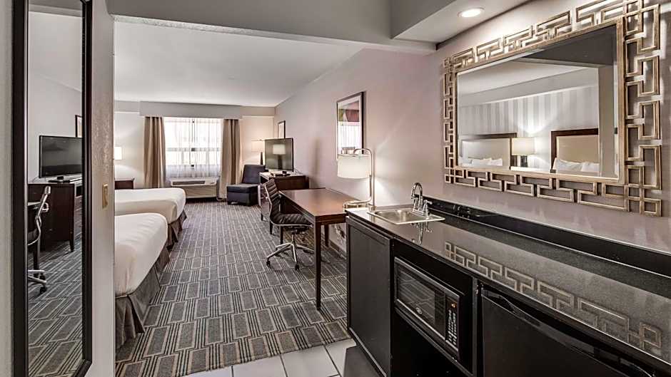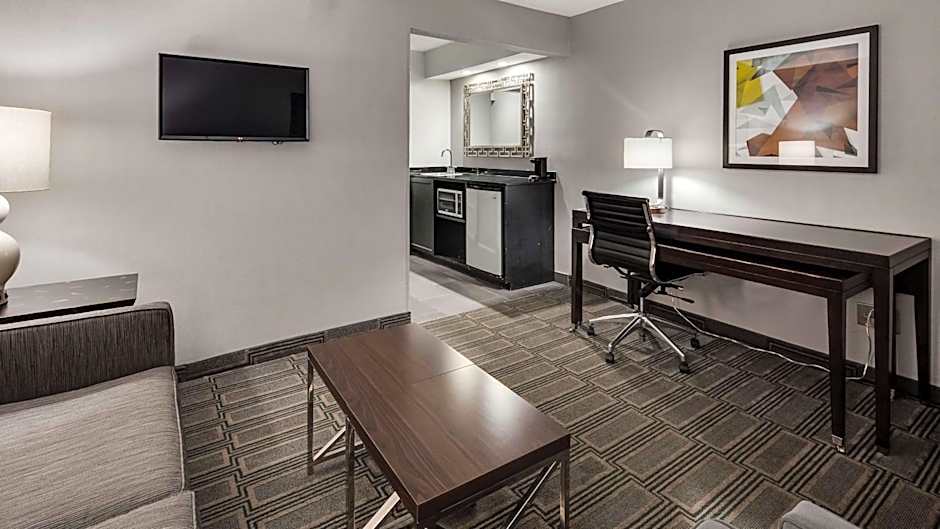 This suite features a separate living room area with a sofa, a microwave and a small refrigerator.